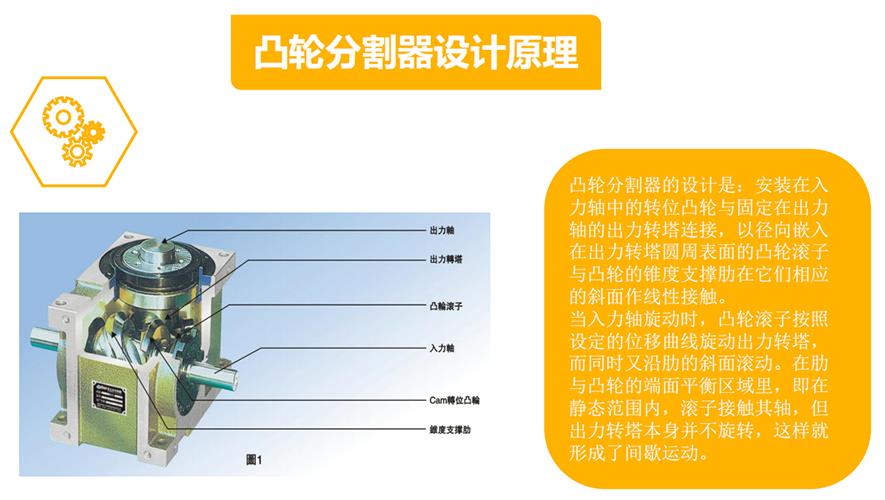开云集团中国有限公司官网的设计原理是:安装在入力轴中的转位凸轮与固定在出力轴的出力转塔连接,以径向嵌入在出力转塔圆周表面的凸轮滚子与凸轮的锥度支撑肋在它们相应的斜面作线性接触。当入力轴旋动时,凸轮滚子按照设定的位移曲线旋动出力转塔,而同时又沿肋的斜面滚动。在肋与凸轮的端面平衡区域里,即在静态范围内,滚子接触其轴,但出力转塔本身并不旋转,这样就形成了间歇运动。