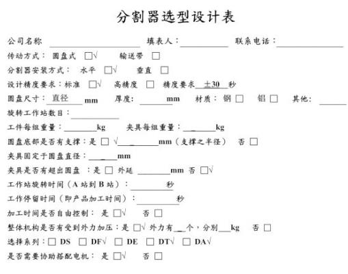 分割器选型设计表填写信息如下: 公司名称/填表人/联系电话 传动方式:圆盘式口、输送带口 分割器安装方式:水平口重直口 设计精度要求:标准□N高精度口精度要求土30秒 圆盘尺寸:直径mm厚度: mm材质:钢口铝口其他 旋转工作站数目 工件每组重量 kg夹具每纽重量 圈盘底部是否有攴撑:是口 mm(支撑之半怪)否□ 夹具固定于圆盘直径 夹具是否有超出圆盘:是口外延 工作站旋转时间(A站到B站) 工作停留时间(即产品加工时间) 加工时间是否自由控制:是口否口 整体机构是否有受到外力加压:是口N外力有个·分别kg否口 选择系列:口DS口DF口DE口DTv口DA 是否需要协助搭配电机:是□N否口